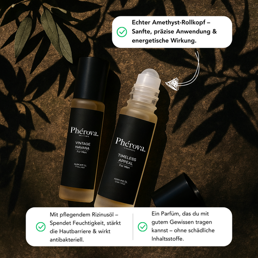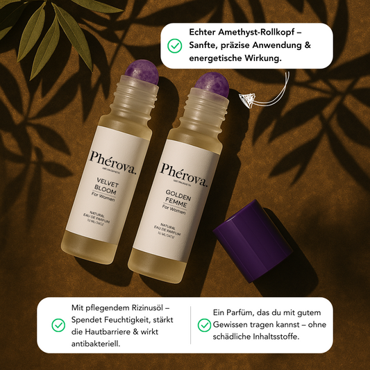 Unsere Phérova-Düfte sind mit einem praktischen Roll-On-Kopf ausgestattet, der das Auftragen einfach macht. Trage den Duft sparsam auf die warmen Stellen des Körpers wie den Nacken, die Handgelenke und eventuell auch hinter die Ohren auf. Rolle den Duft sanft auf die Haut, um eine gleichmäßige Verteilung zu erzielen. Diese warmen Stellen sorgen dafür, dass der Duft langsam freigesetzt wird.
